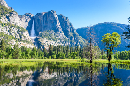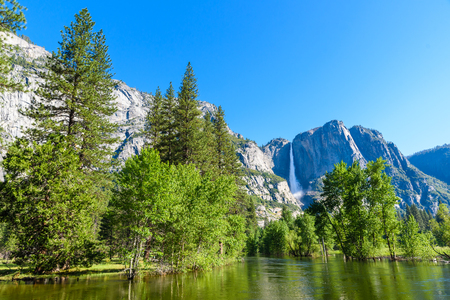 ヨセミテ国立公園 ヨセミテの滝と美しい山の風景のマーセド川の反射 カリフォルニア アメリカ合衆国 の写真素材 画像素材 Image 90399502