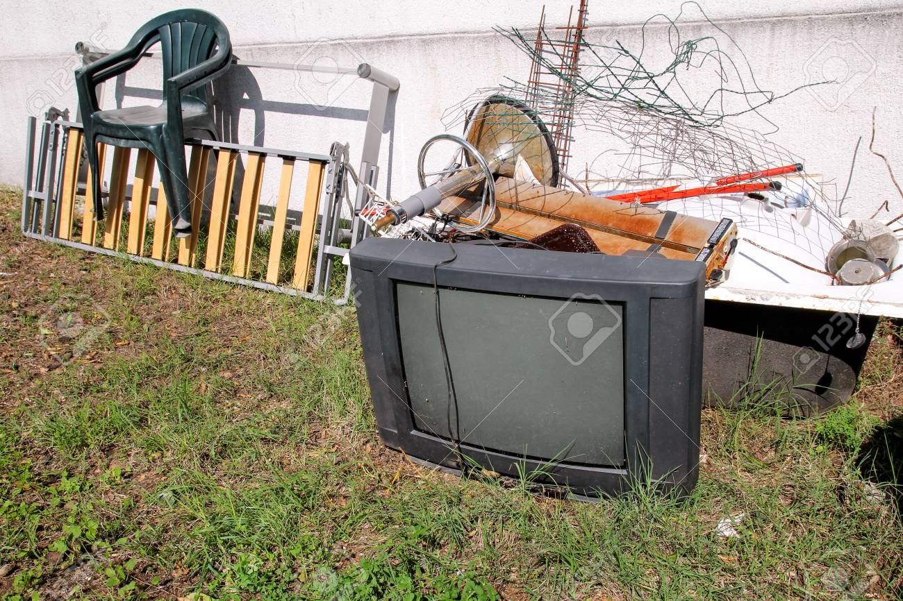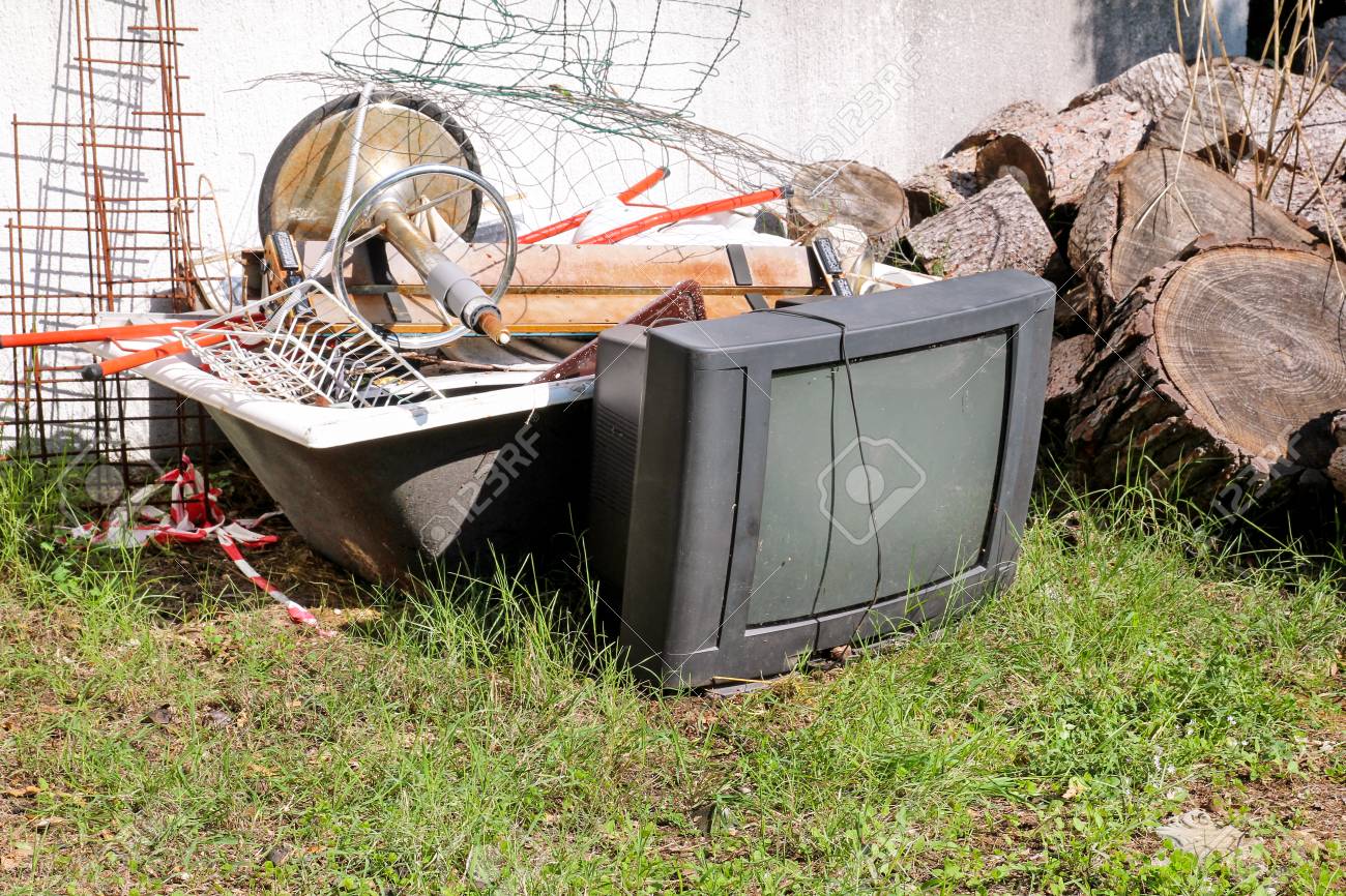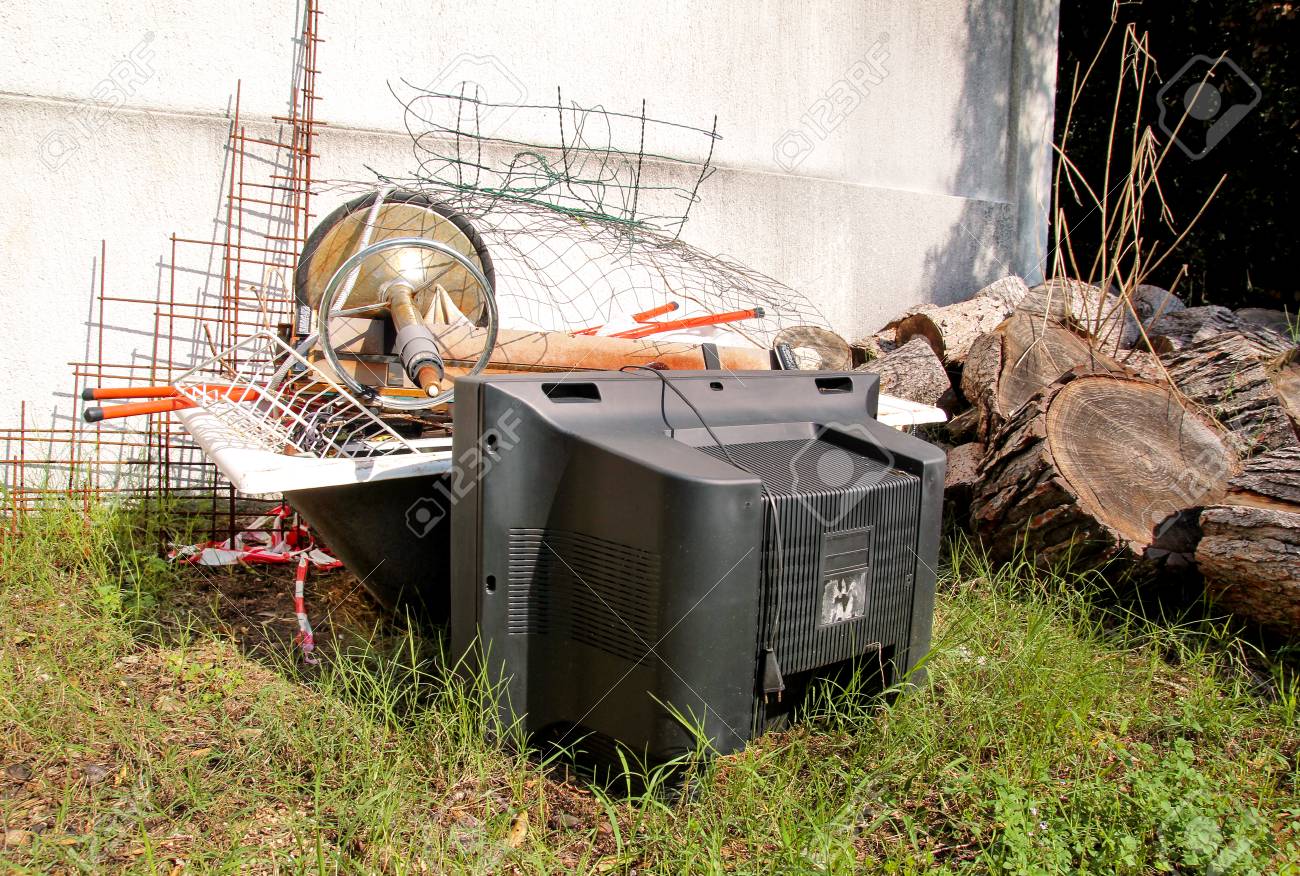 昔のテレビは 他のかさばるゴミと一緒に庭でダンプと左を設定します 昔のテレビは 自然環境の混在のゴミの山が付いている壁の横に捨て リサイクル業界 エコロジーではないです 生態学 の写真素材 画像素材 Image 90018352